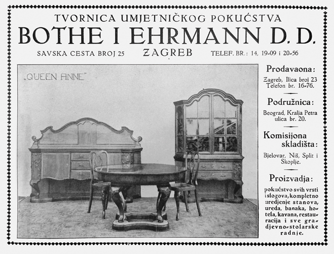Početkom XX. st. hrvatska industrija zabilježila je znatne razvojne pomake. Prirodni resursi pogodovali su drvnoj industriji, a time i proizvodnji namještaja. To je razdoblje procvata tvornice namještaja Bothe i Ehrmann sa sjedištem u Zagrebu i poslovnicom u Beču. Tvornica je proizvodila moderan i funkcionalan namještaj s odlikama florealne i geometrijske secesije, većinom prema predlošcima hrvatskih arhitekata. S tvornicom su među ostalima surađivali → Martin Pilar, → Viktor Kovačić, → Aladar Baranyai, → Ignjat Fischer, → Stjepan Podhorsky, → Hugo Ehrlich i dr. Istodobno su u Osijeku djelovale tvornice pokućstva Rudolf Kaiser (osnovana 1865) i Josip Povischil (osnovana 1884), a u Varaždinu podružnica industrije namještaja od vijenoga drva Mundus (osnovana 1900., od 1923. Thonet-Mundus). Za opremu interijera javnih građevina i stambenih objekata bile su zaslužne i tvornica keramičkoga posuđa i peći Josipa Kalline (osnovana 1885), konkurentska tvornica građevne keramike Armina Schreinera te radionica Ivana Marinkovića (osnovana 1909) specijalizirana za vitraje. Zahvaljujući dobro osmišljenoj poslovnoj strategiji, proizvodi te industrije arhitekturi i urbanim prostorima dali su specifičan identitet moderne urbane kulture, posebice grandioznim projektima zagrebačke zgrade Nacionalne i sveučilišne knjižnice (danas Hrvatskoga državnog arhiva), bolničkih kompleksa, hotela, kavana i kino-dvorana. Navedena su poduzeća najkvalitetniji dio produkcije također zasnivala na predlošcima istaknutih hrvatskih arhitekata i likovnih umjetnika.