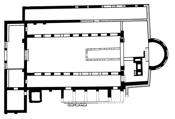 Bazilike, uglavnom jednobrodnih ili trobrodnih longitudinalnih tlocrta, orijentacije zapad-istok, temeljni su tip ranokršćanske crkve razvijen iz antičkih predložaka basilice forensis i basilice domus te kućnih crkava (gradile su se nakon 313). Zbog specifičnih liturgijskih prilagodbi u interijeru se na mjestu antičkoga apsidnog tribunala postavljala biskupska stolica (cathedra), polukružna svećenička klupa (subsellium) te oltar (ponekad nad grobnom mučenika) akcentiran ciborijem i propovjedni ambon. Apside su isprva bile upisane u ravno začelje glavne lađe (IV. st.), poslije polukružno istaknute prema obrascu rimskih bazilika (dominantno u V. st.), a u bizantskoj su fazi (VI. st.) pod ravenskim utjecajima često izvana bile poligonalne. U crkvenoj lađi (navis, naos) ispred apside i trijumfalnog luka postavlja se schola cantorum, kod jednostavnijih građevina samo oltarna pregrada (septum). Uz svetište su pomoćne prostorije – pastoforije (sjeverna je prothesis, spremište žrtvenih darova; južna diaconicon, preteča sakristije). Ispred zapadnoga pročelja čest je ulazni trijem (narteks), a kod reprezentativnih primjera i atrij s obrednim zdencem (kántharos).